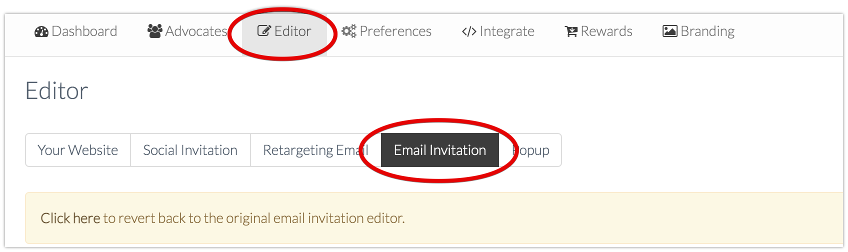 Once you have saved the mode of referral as ‘Sent by you on behalf of your customer’ go to the ‘Editor’ section of your Gather account and select the ‘Email Invitation’ tab.