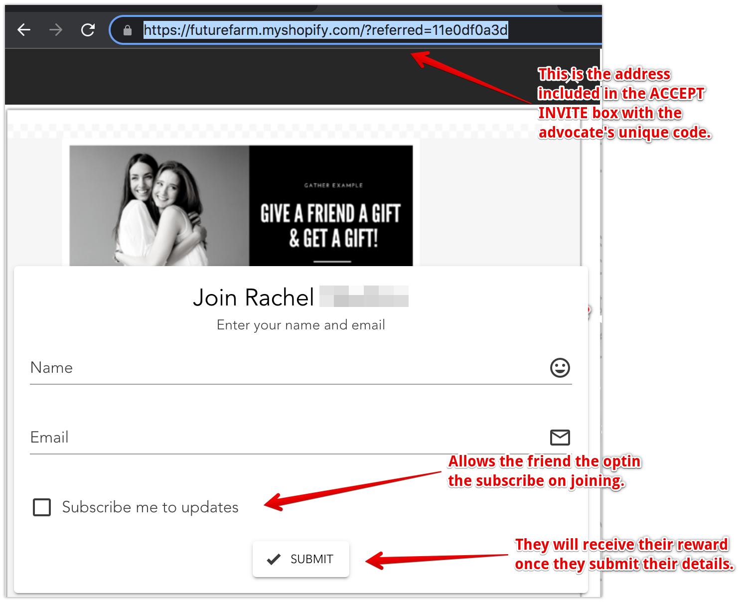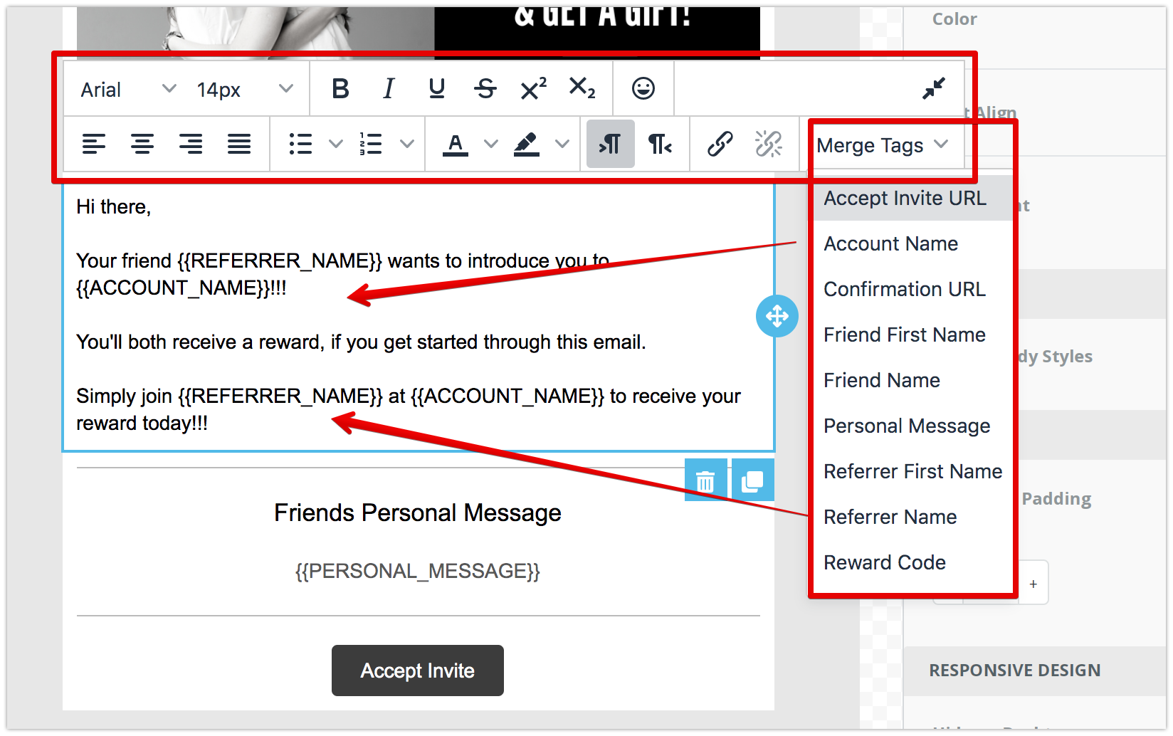 If you want to allow a friend to be able to ‘opt-in’ or subscribe when they accept an email invitation, can change the URL of the accept invite button to open the referral sidebar using the advocate’s unique code. To do this include the URL of the website page you want the friend to land on and the merge tag {{REFERRAL_CODE}} in the editor.