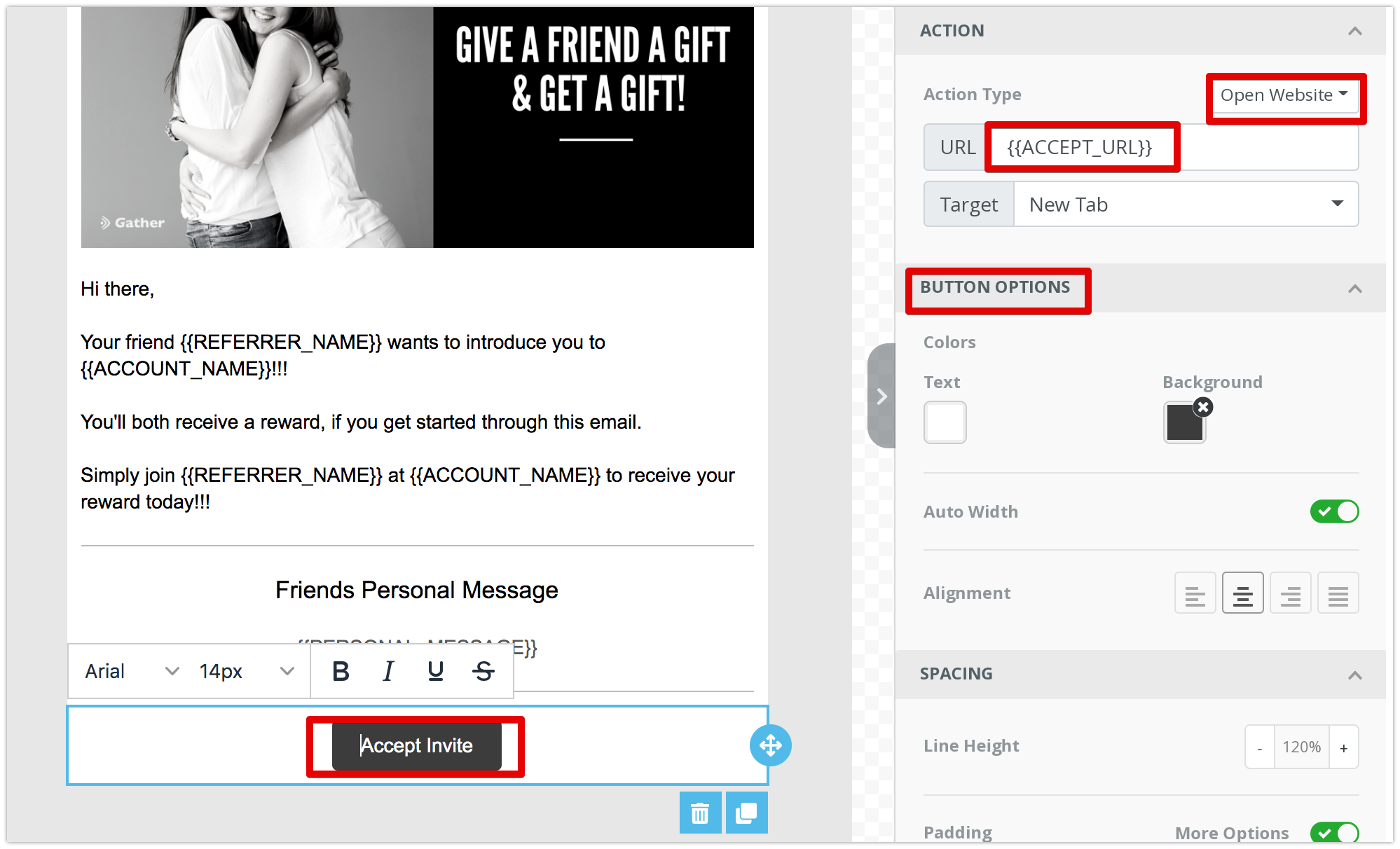 The Gather email editor is applicable to campaigns where you would like to send the invitation email to your customer’s friends on their behalf.