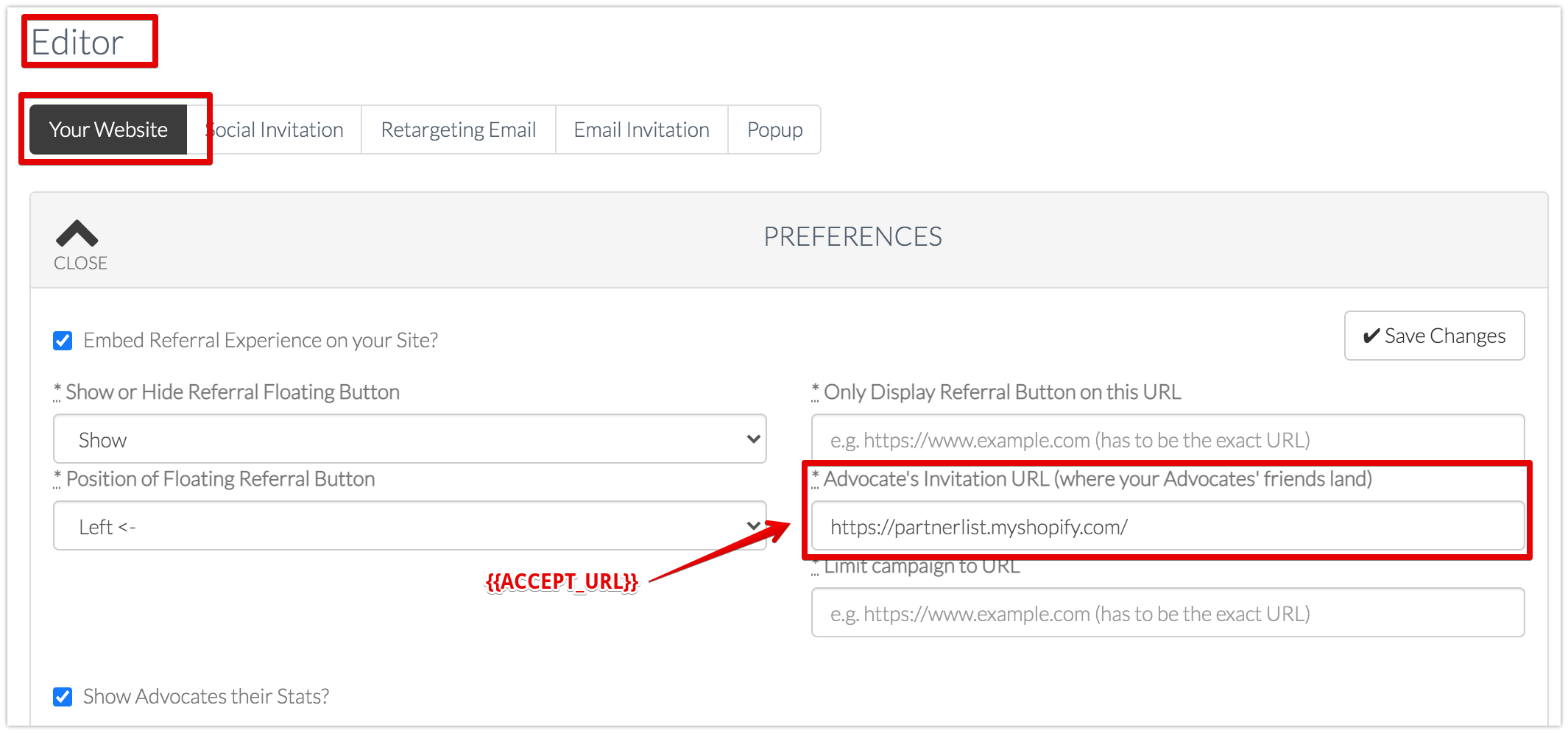 By default, clicking on the button, the friend will be redirected to the URL you specify in Editor > Your Website section, in the Advocate Invitation URL field. This is denoted by the {{ACCEPT_URL}} merge tag.