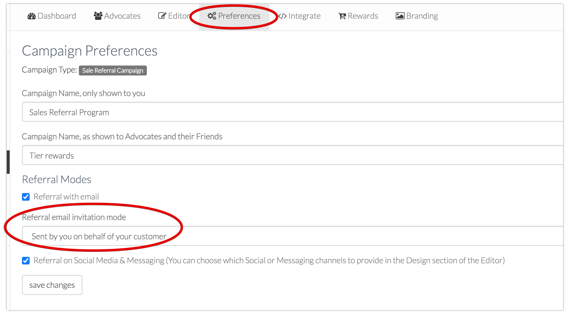 To send the invitations on your customer’s behalf, using the Gather email editor, navigate to the ‘Preferences’ section of your Gather account and save the referral mode from the menu, as shown in the image above.